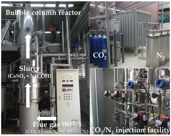 A representative bench-scale plant study with continuous process was conducted from 2010 to 2015 by the Korea Institute of Geoscience and Mineral Resources (KIGAM) (Figure 5) [22]. Experiments were conducted by manufacturing a bench-scale continuous gypsum carbonation facility, and the reaction system consisted of a bubble column reactor (left of Figure 2) and CO2 and nitrogen (N2) injection facilities (right of Figure 2). The bubble column reactor increased the dissolution efficiency of CO2 such that the flue gas injected into the lower part of the slurry passed through the slurry and moved to the upper part. This study was conducted using FGD gypsum, which has a composition of 32.49 wt% CaO and 44.84 wt% SO3, generated in a thermal power plant, and was used as a raw material for carbonation without pretreatment to improve carbonation reactivity. A slurry with a solid–liquid ratio of 15 wt% containing 120 wt% NH3 based on a chemical equivalent was injected at a rate of 240 kg/h, and 15 vol% of CO2 was injected at a rate of 80 kg/h. Optimization was performed by operating a 1000 ton/year scale facility for 2000 h, resulting in a 97% carbonation rate and crystallization of ((NH4)2SO4).