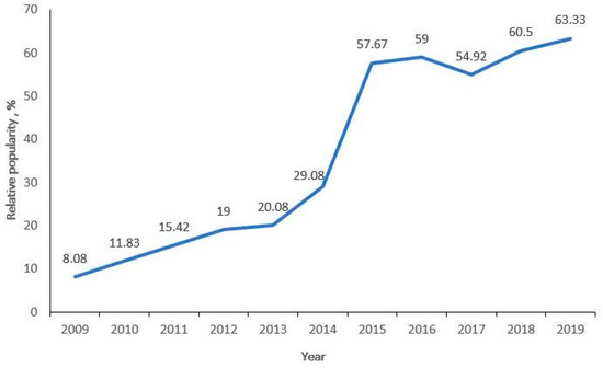 Web search interest in the smart city topic—relative popularity of queries in 2009–2019 (Source: Calculated using Google Data (n.d.)). Note: The relative popularity metric is calculated by dividing the number of searches on the topic by the total number of searches on any topic over a given period of time. The results are then ranked on a 100-point scale (from low (0) to high (100)), reflecting the popularity of the topic relative to the popularity of queries on any other topic.