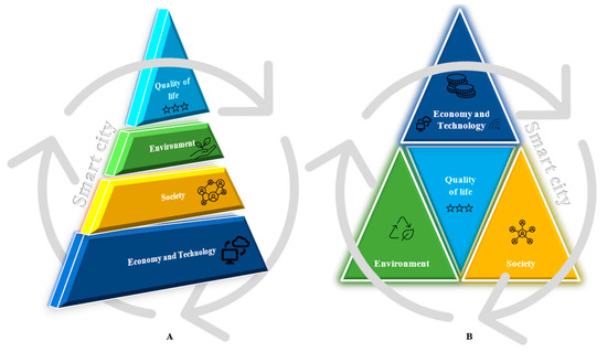 Alternative smart city (SC) concepts. (A)—traditional techno-centric concept; (B)—the proposed human-centric concept.