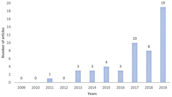 As evidenced in Figure 5, the first paper we identified on SC criteria was published in 2011, and research interest in the topic increased in 2013–2016, when 3–4 papers on the topic were published each year. After 2017, the number of publications on the topic surged, with eight papers being published in 2018 and twice as many in 2019. This increase of interest in SC identification is likely due to a number of recent developments, such as the initiation of Cisco’s USD 1 billion City Infrastructure Financing Acceleration Program [76]; the beginning of the Neom Smart City construction in Saudi Arabia, termed “the most ambitious project in history” [77]; the initiation of Japan’s national strategy for transitioning towards a Super Smart Society, or Society 5.0 [78]; and the implementation of Huawei’s SC concept in 60 cities worldwide [79].