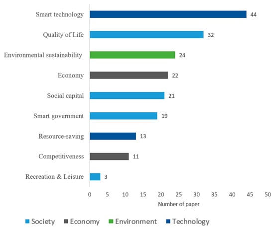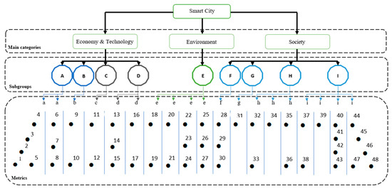 Figure 8 categorizes the SC identification criteria, starting from three main categories (economy and technology, environment, and society) to the nine generalized subgroups (smart digital technology, smart use of resources and energy saving, competitiveness, economic development, environmental (ecological) sustainability, social capital, leisure, smart management and policy making, and living conditions), as well as the 48 specific empirical metrics identified.