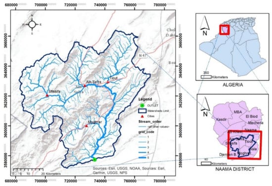 Ain Sefra is in the southwest of Algeria, in the west part of the Ksour Mountains. The geographic situation is between 3,580,000 to 3,660,000 m north latitude and 680,020 to 780,050 m east longitude (Figure 1). The watershed spans a total surface area of 4590.2 km2, or about 15.4% of the Wilaya of Naâma’s entire area. The research area’s estimated elevation ranges between 804.5 m and 2219.4 m. The study area represents the upper side of the large hydrological Saharan system of Wadi Namous. Due to its geographic location, Ain Sefra shows arid to semi-arid climatic conditions, and the hydrological behaviors are characterized by spatial and temporal variability [35]. From a hydrogeological point of view, the watershed is characterized by three aquifer systems of groundwater resources: the quaternary aquifer, the aquifer of lower cretaceous sandstones, and that of the Jurassic sandstones [36]. The region’s groundwater resources are extracted through wells, deep wells, and springs. As per the 2008 census, the region of Ain Sefra, which includes the municipalities of Ain Sefra, Sfissifa, Tiout, and Moghrar, had a total population of 65,860 inhabitants [37]. To supply drinking water and irrigation, the population in the study area is primarily reliant on groundwater sources. Mineral soils, limestone-magnesia soils, saline soils, and poorly graded soils are the four types of soils found in the Ain Sefra basin [38]. Except in the mountains, where remnants of primeval forests can be found, the vegetation of the area is characterized by a steppe physiognomy. From the south to the north, the aspect of the steppe changes with the composition of the soil and the rainfall gradient. The aspect of the steppe changes with the rainfall gradient and the nature of the soil from the south to the north. It should be emphasized that the Ain Sefra region still has a major sand encroachment problem in many of its communities [39].