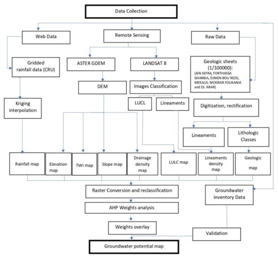 Potential groundwater regions in the catchment of Ain Sefra were assessed using a variety of potential datasets such as geology, elevation, rainfall, topographic wetness index (TWI), land use, slope, drainage density (DD), and density of lineament (LD). In the end, we performed an additional yield data of 45 groundwater samples representing the region’s aquifers to validate our results. The processes adopted in this analysis for demarcating various groundwater prospect zones in the watershed of Ain Sefra have been portrayed in Figure 2.