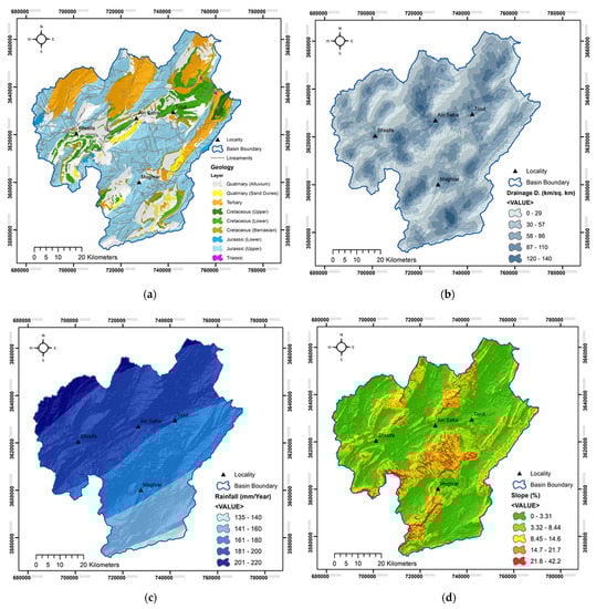 The percolation and infiltration of surface water into aquifers are heavily influenced by geology. Our region is part of the Ksour Mountains. Therefore, its geological background has been studied extensively in the past [59,60,61,62]. Figure 3a shows the geology map obtained from the watershed of Ain Sefra. The geological age of the study area ranges from the Triassic to the Quaternary, with Mesozoic formations dominating, consisting of sandstone rocks units [35]. The sandstones generally occupy the center of the synclines of the Ksours Mountains. They are present in large successive banks. Jurassic sandstones are widespread over 2022.7 km2, covering about 44.05% of the study area; their permeabilities are generally flat. The Quaternary covers about 1112.68 km2 (24.23%) of the area. It consists of alluvium, sand, and gravel, known by their high infiltration. Low Cretaceous sandstones covering about 627.17 km2 (13.66%) of the area; their permeabilities are in general high [36]. Tertiary limestones represent about 785 km2 (17.11%) of the study area, known by their medium permeability. The other (<2%) is filled with Triassic and Berriasian formations.