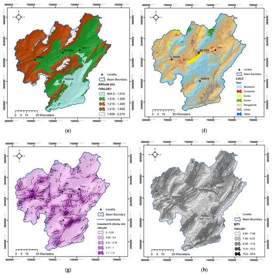 Influencing factors maps of Ain Sefra watershed. (a) Geology map. (b) Drainage density. (c) Rainfall map. (d) Slope Map. (e) Altitude Map. (f) LULC map. (g) Lineament density map. (h) Topographic Wetness Index map.
