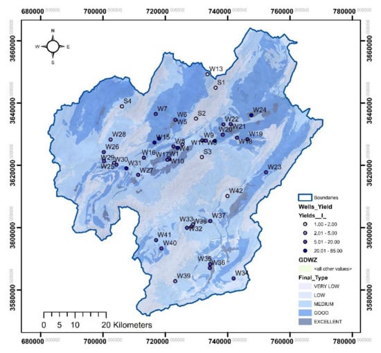 Validation is one of the most relevant scientific research criteria. For the goal of comparing the qualitative findings of the groundwater potential zones, the yield of water sources was chosen as a better option than other available data. The samples were heterogeneous to cover almost all the study area; their positions can be seen in the drainage density map (Figure 4). The highest yield among groundwater data collected was Slih (F42) with 85 L/s. While the least yield was observed from the spring of Ain Serara (S3) with an output of 2 L/s. According to the British Geological Survey, well yields can be grouped into five categories: well rates between 0 and 0.1 L/s were classified as extremely low, 0.1 and 2 L/s as low, and 2 and 5 L/s as very high. Moderate, 5 and 20 L/s, and greater than 20 L/s were recognized as highly promising groundwater basins [75]. The classification summary of aquifer productivity of the research field is given in Table 7.