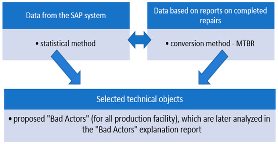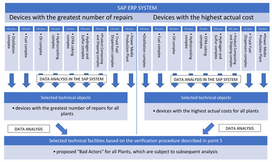 The method of identifying “Bad Actors” using the data obtained from the SAP ERP (Enterprise Resource Planning) system is mainly used for placing orders, ordering and retrieving materials needed for repair, settlement of commissioned works, post-repair reports, as well as for all accounting activities. It is used by industry engineers, production engineers, maintenance engineers and repair contractors (mainly LOTOS Service), who supply it with data related to the implementation of repairs. The organizational instruction used in the company called: “Identification, monitoring and reduction of “Bad Actors” in the process of maintenance and repairs” allows for the analysis of the list of functional locations in terms of: