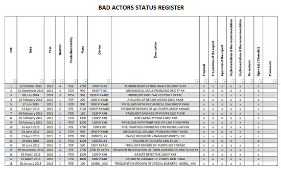 The proposed research methodology for supporting all operation management strategies at the LOTOS Group, described in Section 3, allows for more accurate identification of “Bad Actors” by employing and combing different methods, as shown in Figure 2. The first method, based on the data obtained solely from the ERP system, was initially implemented at LOTOS in 2005. This method has had to be modified in recent years due to the continuous development of infrastructure, with an increased number of technical objects. In the current approach, the data from the ERP system and the data obtained from reports on completed repairs are analyzed simultaneously. This method uses the conversion of the MTBR efficiency index for the assessment of problematic production areas with frequent maintenance of machines and devices. At LOTOS, this allowed for significantly extending the time between the repairs. The above-mentioned methods are described in detail in the following chapters.