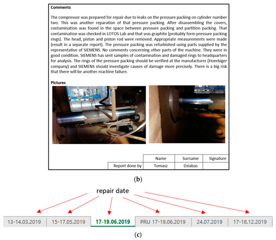 Reciprocating compressor repair report (a) with comments and pictures (b) for specific repair date (c).