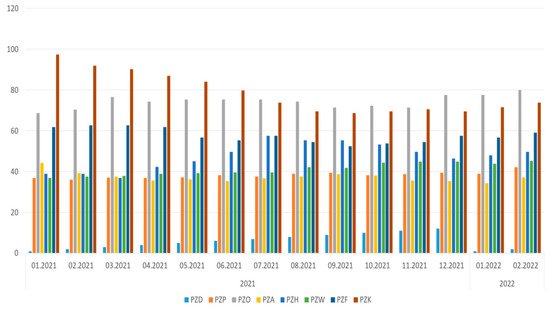 Then, going down one level, it can be observed for which groups of devices there are problems at specific Production Plants (Table 8 and Table 9, Figure 6). The deterioration of statistics in relation to the previous year is marked in shaded boxes, which means that, in these areas, special attention should be paid to technical objects and the reason for such a state of affairs should be analyzed.