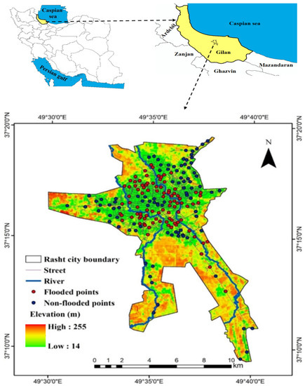 In total, data from 93 flooded observation points from 2009 to 2020 were used from the regional water company of Gilan Province and combined with field surveys. In addition, 93 non-flooded points were randomly chosen using ArcGIS 10.7 (Figure 1). The locations of flooded sites indicated which urban areas in Rasht are vulnerable to flooding.