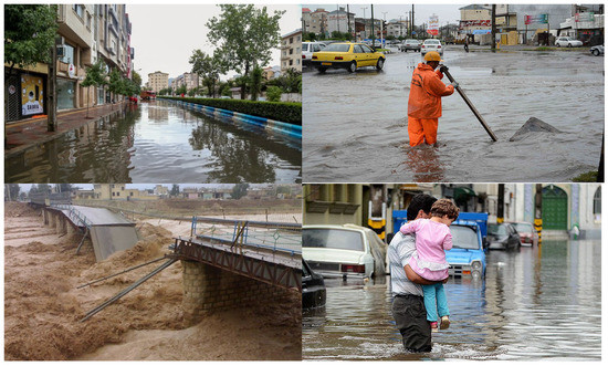 Among natural disasters, flooding is one of the most destructive hazards causing severe economic damage, and climate change is expected to increase its severity in many parts of the world [1,2]. Population growth, industrial expansion, and lack of space for construction, especially in metropolitan areas, have caused drastic changes in the morphologies of urban watersheds and increased the flooding in urban areas and risks of losses of human lives and properties. From 1998 to 2017, more than two billion people were affected by flooding throughout the world [3]. Iran has been severely affected by flooding in recent years [4]. For instance, in March 2019, at least 28 out of 31 provinces of Iran were affected by heavy floods for two weeks, causing infrastructure destructions of more than USD 3.5 billion [5,6]. Due to the highly destructive impacts of floods, there is a great need for improved flood-risk mapping. However, the scarcity of available hydrological and land-use data causes difficulties in managing flooding, especially in developing countries [7,8].