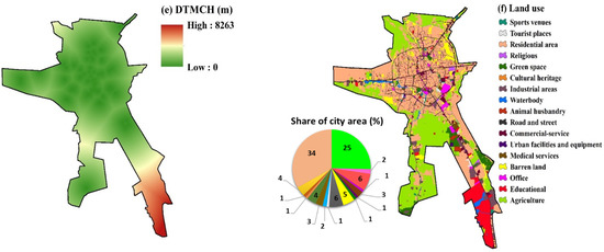 High population density (PD) indicates a higher vulnerability to flooding (Figure 3a). The PD data were collected with a pixel size of 12 × 12 m and grouped into five classes: very high, high, moderate, low, and very low. Very high PD, e.g., had a range of 200–250 people per ha. Dwelling quality (DQ) indicates building conditions and was divided into five classes: very high, high, moderate, low, and very low. It was assumed that buildings with high DQ are more resistant to damage. Household income (HI) is the combined income of all members of a household above 18. Floods tend to influence all income classes in an area; however, it was assumed more affluent households need a shorter recovery time after a disaster [50,51]. HI was also divided into five groups (very good, good, moderate, poor, and very poor) according to information from the Ministry of Cooperatives, Labor, and Social Welfare (2019). The distance to cultural heritage (DTCH; Figure 3d) describes where most of the cultural heritage is located in the city. When the DTCH decreases, the vulnerability increases. The distance to medical centers and hospitals (DTMCH) is another important factor. An increase in DTMCH is directly linked to vulnerability. The Euclidean distance tool in ArcGIS 10.7 was applied for preparing maps of DTCH and DTHMC. Land use is another important indicator of flood vulnerability. Runoff varies to a great extent depending on land use [6,18]. The land-use map was divided into seventeen categories (roads and streets, agricultural areas, offices, educational venues, religious venues, commercial service venues, urban facilities and equipment, sports venues, barren land, water bodies, tourist places, medical services, green space, cultural heritage, animal husbandry, industrial areas, and residential areas). Residential and agricultural areas occupied the largest areas and about 34 and 25% of the city, respectively.