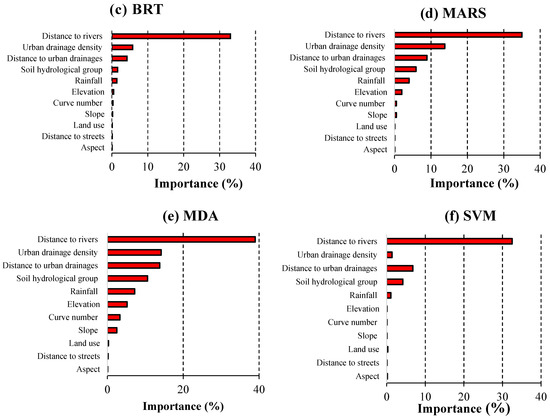Selecting suitable conditioning factors is important in flood-hazard modeling [81]. In the present study, the sensitivity of the factors was investigated using a jackknife test, which is a fast and powerful method using partial-derivative calculations. Further details about the jackknife test are described by Skinner and Rao [82]. The relative importance of the flood-hazard factors used is shown in Figure 7. Distance to rivers (DTR) was the most influential factor, followed by urban drainage density (UDD) and distance to urban drainage (DTUD). Figure 8 shows that DTR was the most important among all the models (38, 29.1, 33, 39, 35, and 33 for the CART, RF, BRT, MDA, MARS, and SVM models, respectively). The importance of UDD and DTUD in the CART method was about 23 and 12, respectively; all other factors were less than five (Figure 7a). In the RF and BRT models, the importance of all the conditioning factors (except DTR and UDD) was less than five (Figure 7b,c). According to the MARS model, DTR, UDD, DTUD, and soil hydrological group (SHG; with 35, 14, 9, and 6) were the most significant factors in the flood hazard map (Figure 7d). In the MDA model, the importance of the DTR, UDD, SHG, and rainfall was about 39, 14, 14, 11, and 7, respectively; all the other factors were less than five (Figure 7e). In the SVM model (Figure 7f), the most important factors were DTR and DTUD (values equal to 33 and 7, respectively).