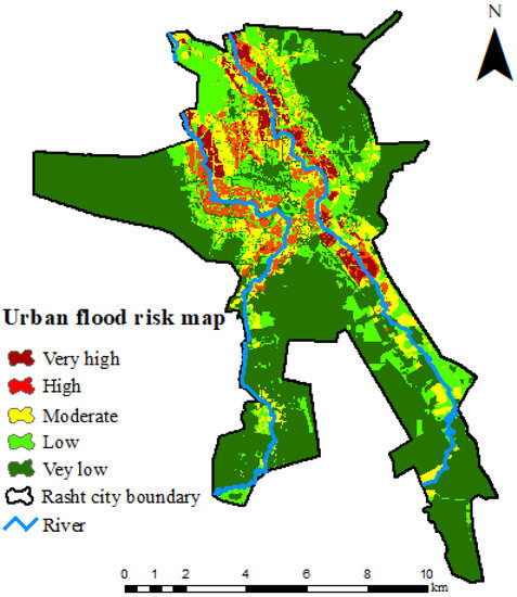 The risk is a function of hazard and vulnerability [42]. The vulnerability is linked to socioeconomic indicators, and the hazard is linked to environmental indicators. Flood hazards may be low in an area, but socioeconomic vulnerability may be high or vice versa. Hence, vulnerability and hazards are jointly important for risk analysis. The flood-risk map was produced for Rasht based on the vulnerability and flood-hazard maps [75,76]: