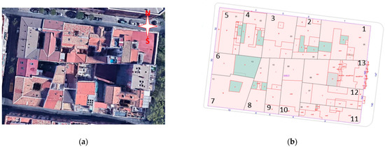 Block in the District of Tetuán, Madrid: (a) Satellite view; (b) Electronic Cadastral Site data: 13 buildings.