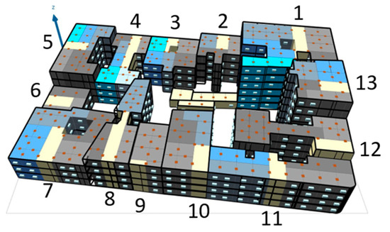 The internal partition generated for every building is shown in Figure 3. In every building, the consecutive apartments have been highlighted in the same tonal colours. Corridors are represented in yellow. The small brown squares and the light blue rectangles represent the doors and the windows, respectively. No partition of the internal courtyards has been introduced.