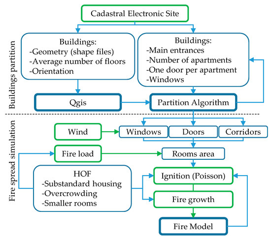 The complete simulation procedure can be observed in Figure 4. The input data is highlighted in green. From the Electronic Cadastral Site, the real geometry of the block is introduced in Qgis, which is adjusted with the partition algorithm to satisfy the restrictions commented above. Once the buildings are correctly partitioned, the geometry of every room is introduced to the fire model. Their orientation and openings area are considered for the input of the wind conditions. In the same way, fire load distribution is introduced according to the expected values of substandard living conditions (Section 2.3).