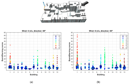 A total number of 1000 simulations have been performed, and their results can be observed in Figure 5. Those obtained from a random distribution of fire ignitions in the same case study, with the mean prescribed values of fire load according to the national standards, throughout the total number of dwellings are shown in Figure 5a. The results from a Poisson distribution of fire ignitions with the random distribution of fire load density commented above can be observed in Figure 5b. The final number of rooms that have been completely burnt out or that are still burning after 60 min from ignition are represented. The different markers in Figure 5 represent the highest floor the fire has reached after the period of time, “0” being the ground floor. A bee swarm chart has been chosen to display the results to show the possible repetitiveness of fire spread, as the same amount of affected rooms can be obtained for different initial fire locations. It has to be mentioned that the total number of affected rooms by fire has been chosen as a relevant measure of the damage caused, considering this number will directly impact the life of residents.
