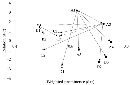 - Fourth, we determined the interactional relationships between the risk factors. We assumed that in the total influence matrix T, represents the sum of the risk factors in the row, namely, the value of the comprehensive impact of the i-th risk factor on the other factors, and represents the sum of the risk factors in the columns, that is, the total impact on the i-th risk factor by the other factors. The relation of the i-th risk factor can be obtained by . If , it indicates that this risk factor has a significant impact on the other factors, and is called the driving factor. The higher the value is, the greater the influence of the risk factor on the other factors. If the opposite is the case, the factor is called the outcome factor. This was used to construct a diagram of the causal relationships among the risk factors.
