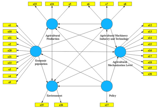 From the analysis above, it can be seen that the factors affecting the sustainable development of agricultural mechanization mainly include economics, society, the population and labor force, agricultural production, land resources, industrial technology development, education, the energy environment, ecology, and policies and regulations. There are many corresponding component indicators with each aspect. The relationships are also more complicated, and the mutually influencing relationship paths are often not clear, so traditional methods of research are more difficult. Therefore, this article focused on the use of structured statistical research methods to comprehensively and quantitatively analyze the relationships among the influencing factors of agricultural mechanization and the path and intensity, as well as to quantitatively verify the conclusions of the qualitative analysis. According to the analysis above and index-selection principles, 28 representative indicators were finally selected from the different categories (socioeconomic, environmental, production and land resource, agricultural machinery industry and technology, agricultural mechanization status and policy support, etc.).