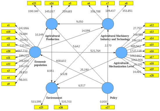 The calculation results of measurement Model B are shown in Table A4. The factor loadings in Table A4 indicate that most of the indicators have a higher explanatory degree, reflecting that the selection of indicators is more representative and indicating that the measurement model’s interpretation ability is good. The negative numbers reflect negative correlations between the indicator and Sustainable Agricultural Mechanization (SAM).