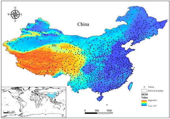 In order to adequately analyze the research results, China was divided into three major regions: humid region (I), sub-humid and semi-arid region (II), and arid region (III), with annual precipitation of >800 mm, 400–800 mm, and <400 mm, respectively. The regional divisions were obtained based on the annual precipitation data from 830 meteorological stations with the Inverse Distance Weighting Interpolation Method, the data were interpolated into1 km gridded data (see Figure 1). There were 383, 261, and 186 meteorological stations in region I, II, and III, respectively (see Table 1).
