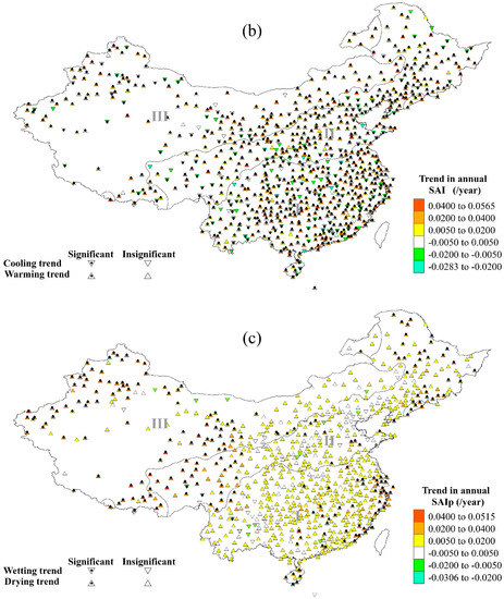 Trend analysis identified 221 meteorological stations with significant (p < 0.05) increases in annual PDI values studied throughout China during 1970–2019, accounting 26.6% of total statistics stations. Regions I, II, and III had 121, 63, and 37 stations with significant increases in annual PDI, accounting for 31.6%, 24.1%, and 19.9%, respectively, of the number of statistical stations in their respective regions. Only 57 stations showed significant (p < 0.05) decreases, accounting 6.9% of total statistics stations. Regions I, II, and III had 13, 17, and 27 stations with significant decreases in annual PDI, accounting for 3.4%, 6.5%, and 14.5%, respectively, of the number of statistical stations in their respective regions (see Table 3). Among the 221 stations with increased annual PDI trends, 216 (accounting for 97.7%) showed significant increases in annual SAIT, and 5 showed significant decreases in annual SAIT. However, 204 (accounting for 92.3%, 204 out of 221) did not show significant trends in annual SAIp, 14 showed significant increases in annual SAIP, and 3 showed significant decreases in annual SAIP (see Figure 2a–c). Among the 57 stations with decreased annual PDI trends, 31 (accounting for 54.4%, 31 out of 57) showed significant decreases in annual SAIT, 14 showed significant increases in annual SAIT, and 12 did not show a significant trend in annual SAIT. Of these 57 stations, 48 (accounting for 84.2%) showed a significant increase trend in annual SAIP, while 9 did not show a significant trend in annual SAIP (see Figure 2a–c).