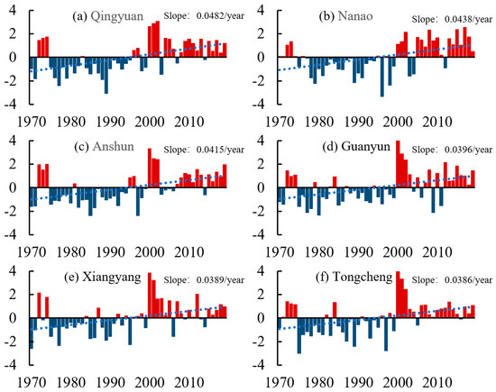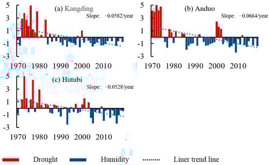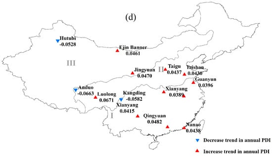 The top 5% of stations with significant changes in annual PDI in each region (see Figure 2a) were selected for extreme stations’ analysis (see Figure 3 and Figure 4). The top 5% of region I stations (6 out of 121) with significant increases in annual PDI had values of 0.0482, 0.0438, 0.0415, 0.0396, 0.0389, and 0.0386/year, respectively. The top 5% of region II stations (3 out of 63) with significant increases in annual PDI had values of 0.0671, 0.0437, and 0.0430/year, respectively. The top 5% of region III stations (2 out of 37) with significant increases in annual PDI had values of 0.0471 and 0.0462/year, respectively. Extreme stations with significant increases in annual PDI of region I had more drought events after 2000 (see Figure 3a–f). Extreme stations of region II had more drought events since the middle 1990s (see Figure 3g–i). The one extreme station of region III had more drought events after 2000 (see Figure 3j), the other one had more drought events since the 1980s (see Figure 3k). The top 5% of region I, region II, and region III stations (1 out of 13, 1 out of 17, 1 out of 27) with significant decreases in annual PDI had values of 0.430, 0.471, and 0.462/year, respectively. Extreme stations of region I, II, and III with significant decreases in annual PDI had more humid years since the early 1990s (see Figure 4a), the middle 1980s (see Figure 4b), and the early 1980s (see Figure 4c), respectively.