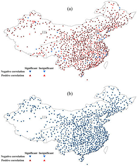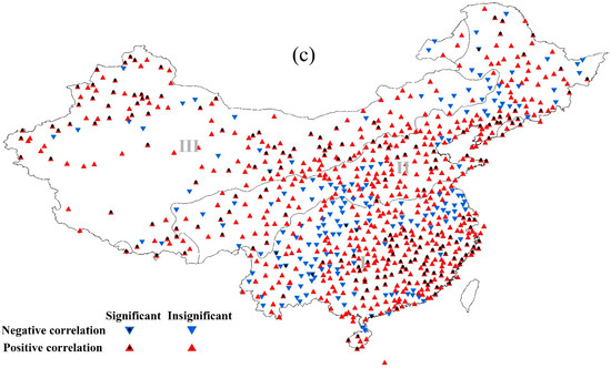 Annual PDI of 703 (85%, 703 out of 830) stations showed statistically significant correlations with annual SAIT (see Figure 5a). Only five of them showed negative correlations, all of which were in region I. The rest of them showed positive correlations, region I, II, and III had 318 (83%, 318 out of 383), 222 (85%, 222 out of 261), and 158 (85%, 158 out of 186) stations, respectively (see Figure 5a). Slightly dissimilarly, annual PDI showed statistically significant negative correlations with annual SAIP at all stations (see Figure 5b). There were 651 (78%, 651 out of 830) stations that showed positive relationships between annual SAIT and SAIP throughout China, but only at about 29% (188 out of 651) of them were significant (p < 0.05) (see Figure 5c). There are 179 (22%, 179 out of 830) stations that showed negative relationships between annual SAIT and SAIP, but only at about 4% (8 out of 179) of them were significant (p < 0.05) (see Figure 5c).