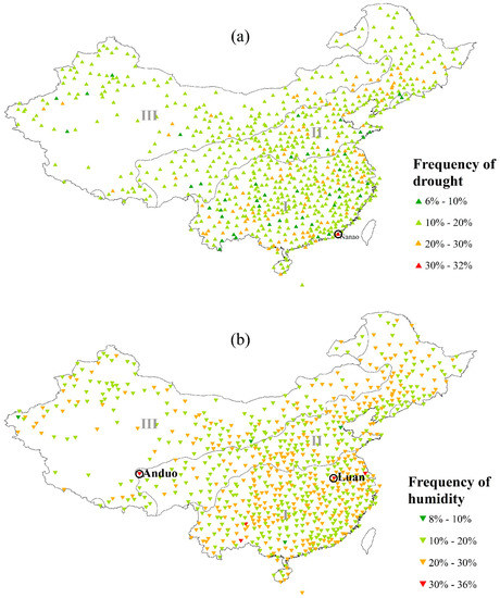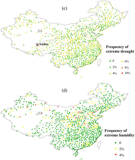 The drought events (PDI > 1) were experienced at all stations studied, with a frequency range from 6% to 32%. The highest number was seen at the Nanao station in region I, Southeast China (see Figure 7a). In addition, all stations also experienced humidity events with a frequency range from 8% to 36%. The highest number was seen at two stations, the Anduo station in region II, West China, and the Luan station in region I, South China (see Figure 7b). On the other hand, most of the stations experienced extreme drought events (PDI > 3), with a range from 2% to 10%, except at all 43 stations with no historical extreme drought experience. The highest number was seen at the Anduo station in region II, West China (see Figure 7c). However, fewer stations experienced humidity events, only 177 stations showed 2–4% frequency of humidity events (see Figure 7d).