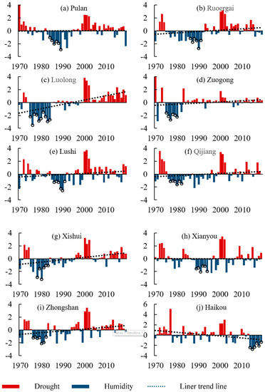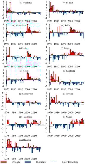 Comparison chart of drought and humidity events at all stations in China selected by the presented research during 1970–2019.