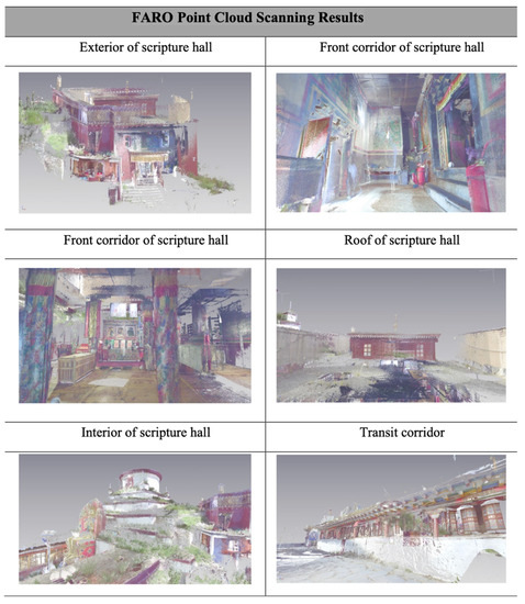 We selected appropriate scan positions and routes based on field surveys and observations, using a FARO portable 3D scanner (This instrument is capable of obtaining 976,000 points of the scanned object per second and can be operated simply and intuitively through a colour touch screen. The instrument also has a built-in coaxial high-resolution camera, which ensures no deviation between the colour image and the point cloud and increases the maximum scanning distance to 350 m. It has a 165-megapixel camera and, importantly, it stitches data in real-time at the scanning site) to scan 48 stations at the Zangniang Stupa and Sutra hall (Figure 4). However, this left some deficiencies. Due to the height of the stupa, it was decided to use drone photography to measure missing parts of the point cloud for the safety of the personnel. The point cloud needed to be systematically classified so that modellers could view it at any time. The point cloud was segmented according to the above-mentioned divisions of the individual buildings, with multiple people collaborating on the work.