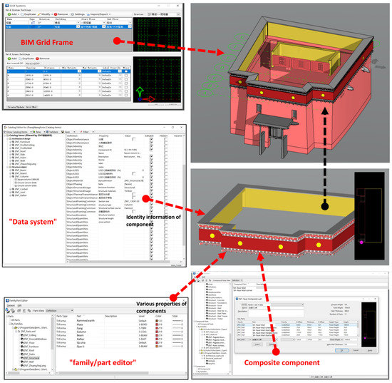 - Based on the current situation and value evaluation standards of the Zangniang pagoda and Sutra hall, if it is required to update and modify HBIM model information, it is necessary to operate in the data management terminal in ABD, namely ‘data system’ and ‘style system’ (Figure 7).