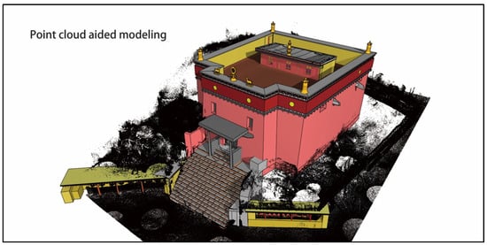 Firstly, use traditional surveying and mapping methods and photography to carry out on-site survey and drafting work, and use it as a compensation mechanism to make up for the detailed data and status of buildings that cannot be recorded in the work creation scanning instruments and equipment, and try to understand and sort out the space, structure, decoration of historical buildings, as well as construction logic, form features, distinctive features, and colour textures. These will help the later archival collation and HBIM model to overlap, as well as more complex heritage information sustainable input and update; secondly, with the help of the 3D laser scanning instrument, the point cloud scanning work is carried out along the set sequence, route and point position, and the final scanning results are classified into different categories through the editing method of cutting and interception, and different point cloud parts can be used as a reference to guide the construction of the HBIM information model. UAVs (unmanned aerial vehicles) can also be used to supplement the shooting of hidden parts of historical buildings and parts that are not accessible due to objective conditions, and use ‘photogrammetry software’ to generate point clouds to supplement the lack of laser scanner point cloud data. This step is carried out in conjunction with manual mapping work.