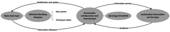 - Sustainable information service mainly provides data exchange in IFC format. Its data services are aimed at information protection of architectural heritage, visual display of architectural heritage, heritage research of cultural relics departments and other organisations, and so on. Of course, the feedback and instructions in the service process will also carry out the work of the basic data layer through the sustainable collaborative sharing layer. For example, the problems of component replacement and damage in the protection process of the cultural relics protection department will also be modified through the operation of the sustainable collaborative sharing layer.