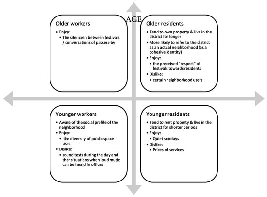 Considering the age aspect from another angle, the overwhelmingly positive evaluations of the district by older respondents, and their appreciation of festivals and events confirming previous findings that QDS is not a district for young people only, but rather on the contrary! A substantial part of our dataset was comprised of older residents (with quite a few retired) who have been living in QDS for years and enjoying the district. The activities of QDS challenge the connection between noise sensitivity, likeliness to complain, and aging, often documented in research [15] or associated with the overall livability of touristified areas [14] or the specific conflicts with visitors for residents otherwise appreciative of their neighborhood both aesthetically and sensorially [6]. Our findings encourage revisiting of the assumption that all younger residents (or workers) enjoy festivals and events while older ones are disrupted and avoid attending the events [15]. Existing notions of aging in the city must be challenged and we posit that festivals can act as cultural resources to support efforts to develop age-friendly cities [18,19].