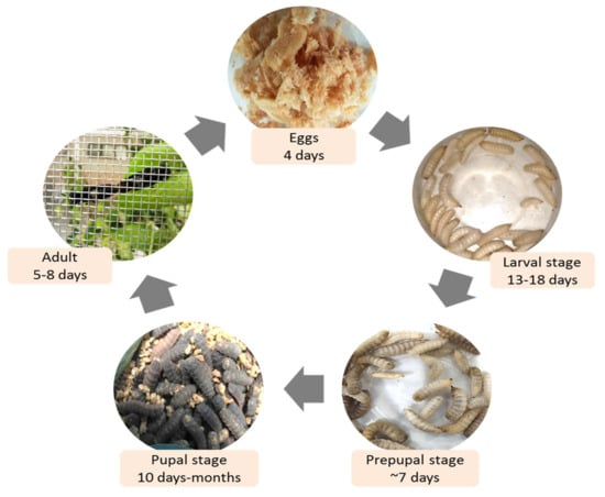 The male BSF emerges two days earlier than the females, and mating occurs after two days. The females lay eggs in crevices in dry areas near the larval substrate; the eggs hatch in about four days into a neonate larvae stage [26]. The larvae grow on organic waste, including manure, food scraps, municipal refuse, and decomposed plant material [22,27]. In the final stage, the larvae can reach 27 mm in length and widths of up to 6 mm, and weigh up to 220 mg [28]. The prepupae, the last larval stage before pupation, empty their digestive tract and leave the food source to search for a dry and safe spot to pupate; this behavior is the “self-harvesting” that eliminates the previously labor-intensive stage of their farming [22]. The larvae have now reached their maximum size and have a 36–48% protein and 33% fat content [29], and will develop into adults in about 14 days [30,31]. Figure 1 shows the life cycle of the BSF, from egg to adult, which takes an average of 40–43 days in the tropics [26]. However, the cycle could take up to four months [32] since the larval and prepupal stages may extend, depending on food availability and other conditions. BSFL feed on as much organic waste as they can and stop feeding once they pupate and transform into adults. The fat reserved in their body is converted into energy for adults’ mating and continuous life cycle [26]. Nevertheless, environmental conditions, such as temperature, light, and humidity, are the critical factors for ensuring a successful BSF life cycle, which will be discussed further in the sub-topic on the BSF treatment system.