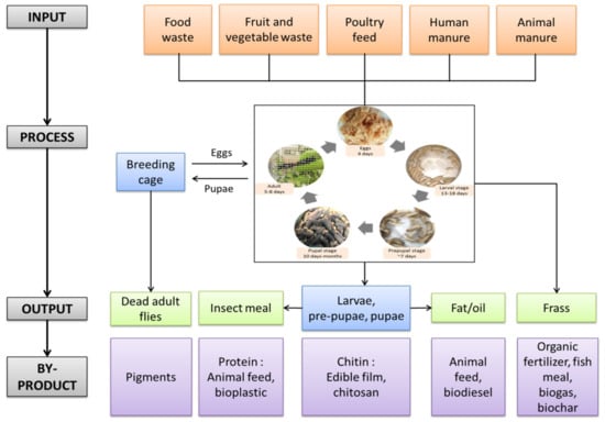 Figure 3 shows the general flow of processing raw wastes to obtain the by-products in the BSF waste treatment system. Based on Figure 3, the utilization of H. illucens flies is promising where the larvae are a source of high-quality protein and, on the other hand, can consume organic waste throughout their lives, consequently reducing the disposal waste. However, when these flies are bred on a large scale, secondary waste is produced, leaving large numbers of dead fly biomass. Ushacova et al. [69] found that this biomass has the potential to be an important renewable source of pigments such as melanin and ommochrome. Overall, all biomass produced throughout BSF organic waste system is useful, and can be converted into valuable products.