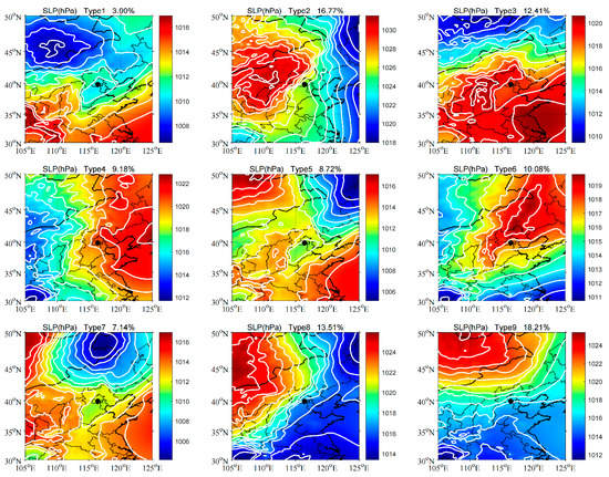 Primary circulation patterns in Beijing from 1979 to 2021. Black dots indicate the location of Beijing in all panels. White contour lines represent SLP values (hPa). Filled color contours represent the air pressure distribution.