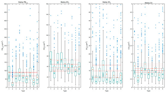 Figure 3 shows the distributions of PM2.5, NO2, SO2, and CO concentrations in Beijing under the nine circulation types (daily average concentrations). The pollutant concentrations were obtained by averaging the data at each monitoring station.