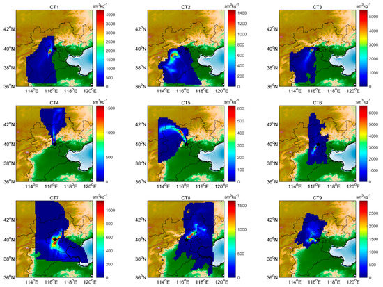 We selected the serious pollution events (highest PM2.5 concentrations) for the nine circulation patterns from 2015 to 2021 and used the FLEXPART-WRF model to conduct 48 h backward simulations to study the residence times of the pollutant unit concentrations and estimate their impacts on the Beijing area. The footprint analysis results are shown in Figure 4.