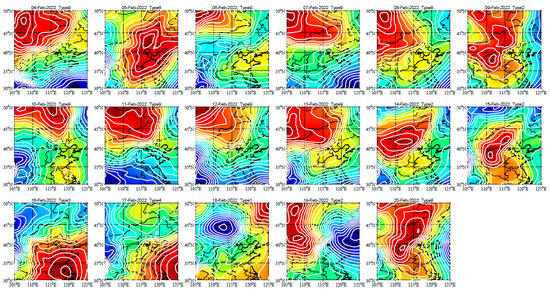 According to the predictions of the EC-Earth forecast model, the distribution of SLP in Beijing during the Winter Olympics was obtained. The daily circulation forecast are shown in Figure 5.