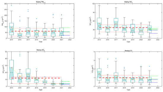 We calculated the trends for the four pollutants from 2015 to 2021 (Figure 6). For the past three years, the overall PM2.5 and CO concentrations increased from 2019 to 2020, and then decreased from 2020 to 2021. Although Beijing was affected by lockdown due to the COVID-19 pandemic in 2020, resulting in reduced emissions caused by human activity, the city’s meteorological conditions were not conducive to the diffusion of PM2.5 and CO [41,42], which likely led to higher pollutant concentrations in 2020 compared to 2019. It is expected that the Beijing Municipal Government will further control emissions during the 2022 Winter Olympics [43,44]. In addition, the circulation conditions during the Winter Olympics should generally be conducive to diffusing pollutants. Therefore, we predict that during February 2022, the PM2.5 and CO concentrations will be similar to those in 2019. Calculating the decreasing ratio of the average concentrations in 2019 to the seven-year average concentrations, we found that PM2.5 would decrease by ~17.4%, while CO would decrease by ~21.2%.