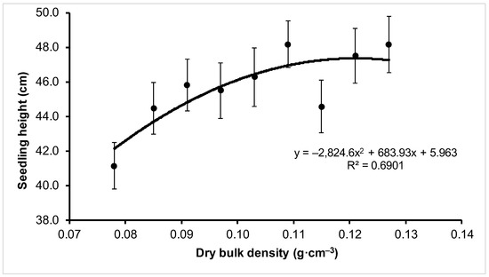The major component used for tray seedling production is a substrate consisting of peat and a small addition of perlite. However, the influence of a wide range different levels of substrate compaction on the growth of seedlings in container nurseries has not been investigated so far. Seedling growth is influenced by the physical properties of the applied substrate, including its compaction level, which is typically expressed as bulk density. Substrate compaction determines the air–water ratio, including the availability of water and nutrients [10,11,12], and microbial activity [13,14]. Several authors have studied the effect of soil compaction on the growth and development of plants. Kozlowski [15] characterized the impact of soil compaction on tree growth. Lipiec et al. [16] analyzed the changes in the growth and function of roots based on soil compaction. Similarly, Passioura [17] investigated how soil compaction can influence root growth. In another study, Hamza and Anderson [18] described the nature and causes of excessive soil compaction on plants and possible solutions to reduce soil compaction. In 2002, the European Commission recognized soil compaction as one of the leading environmental hazards [19], and various authors have confirmed this [20,21,22,23,24,25,26,27]. Their results indicate that soil’s excessive and inadequate bulk density can affect plant development depending on the species and substrate type. Studies on soil compaction have been conducted on Nicotiana L. [28], several grass species [29], nonforest trees, such as Malus Mill. [30] and Ailanthus altissima Mill. Swingle [31], and forest tree species of low significance for Polish forest management, such as Pinus contorta Dougl. ex Loud [32], Pseudotsuga menziesii (Mirb.) Franco [33], Pinus nigra Arn. [5], Pinus ponderosa var. ponderosa Dougl. ex Laws, Pinus taeda L., Pinus echinata Mill. [34], Quercus rubra L. [35], Quercus coccinea Muencch [36], and Quercus pyrenaica Willd. [37]. In studies from Poland, the effect of soil compaction on seedlings growth has been analyzed for Fagus sylvatica L. under laboratory conditions [7], for Quercus petraea (Matt.) Liebl. on soil collected from a nursery bed [38], and for Pinus sylvestris L. in trays containing bark-based substrate [39]. Kormanek et al. [40] demonstrated the effect of soil compaction on the growth of F. sylvatica.