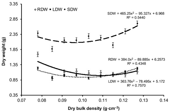 Change in the mean value (±SE) of root dry weight (RDW), stem dry weight (SDW), and leaf dry weight (LDW) of European beech seedlings depending on the bulk density of peat-perlite substrate. Values of dry bulk density (in g·cm−3) for each variant: V1 = 0.078, V2 = 0.085, V3 = 0.091, V4 = 0.097, V5 = 0.103, V6 = 0.109, V7 = 0.115, V8 = 0.121, V9 = 0.127.