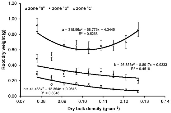 No statistically significant differences were noted between variants with respect to the dry weight of stems and leaves. The root dry weight of the V1 variant was significantly higher than the remaining variants and was almost 2-fold higher compared with that of the V2 variant, which had the lowest dry weight among all variants. The highest dry weight of part (a) of root was obtained for the variants with extreme compaction, i.e., V1 and V9, and the lowest value for the V2 variant. The highest dry weight of parts (b) and (c) was found in the least compacted V1 variant, and lowest was found in the most compacted V9 variant. In contrast with stem and leaf dry weight, the values of root dry weight differed statistically significantly between the variants. Except for the V1 variant, the dry weight of the examined seedling parts (stems, leaves, and roots) showed an upward trend with the increase in substrate compaction (Figure 2 and Figure 3). However, high variability in the results was not observed for the medium values of compaction. The highest value of the determination coefficient (76%) was obtained for the leaf dry weight, a lower value for stem dry weight (54%), and the lowest for root dry weight (43%) (Figure 2). For roots, the value of R2 reached approximately 50% for parts (a) and (b) (Figure 3). The most pronounced influence of compaction was noted for part (c) of root, with as much as 80% of dry weight variability explained by the change in substrate compaction.