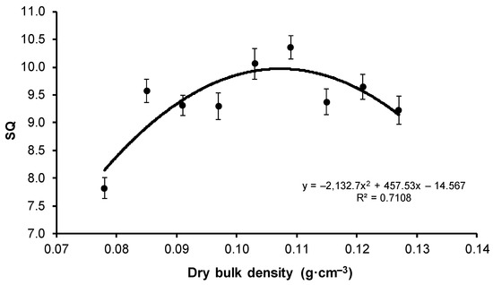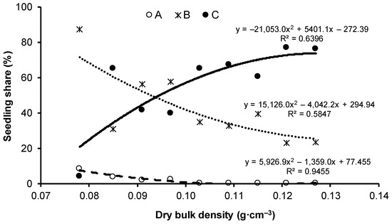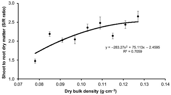 The percentage of seedlings with admissible values of SQ and S/R (i.e., not exceeding the maximum defined for this experiment) decreased with increasing substrate compaction. When the dry bulk density was above 0.091 g·cm−3 (V3) (Figure 6), the percentage of seedlings with admissible values dropped below 50%.
