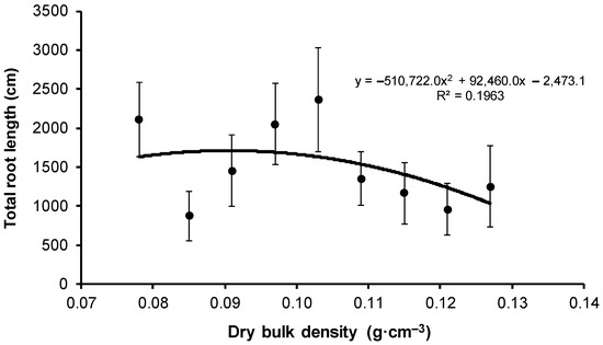 Change in the mean total root length depending on the bulk density of peat-perlite substrate. Values of dry bulk density (in g·cm−3) for each variant: V1 = 0.078, V2 = 0.085, V3 = 0.091, V4 = 0.097, V5 = 0.103, V6 = 0.109, V7 = 0.115, V8 = 0.121, V9 = 0.127.