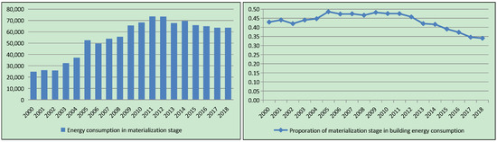 Thirdly, this paper discusses the differences among the different stages of building energy consumption. From 2000 to 2018, the stages of materialization, construction, and operation account for about 42.77%, 4.02%, and 53.20%, respectively, of total building energy consumption. Therefore, the materialization and operation stages are the main sources of building energy consumption. In these 19 years, the annual growth rates of building energy consumption in the materialization, construction, and operation stages are 5.09%, 7.48%, and 7.17%, respectively.
